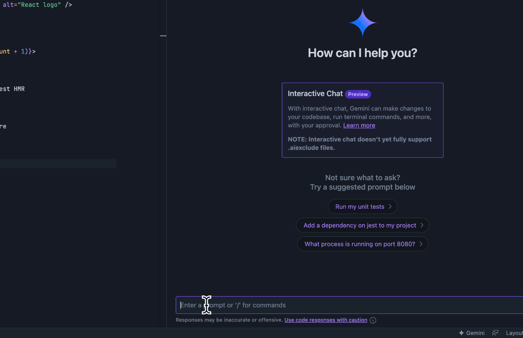 With our new interactive chat feature, Gemini in IDX can answer questions, execute commands, run tests, and even make code changes with your permission.